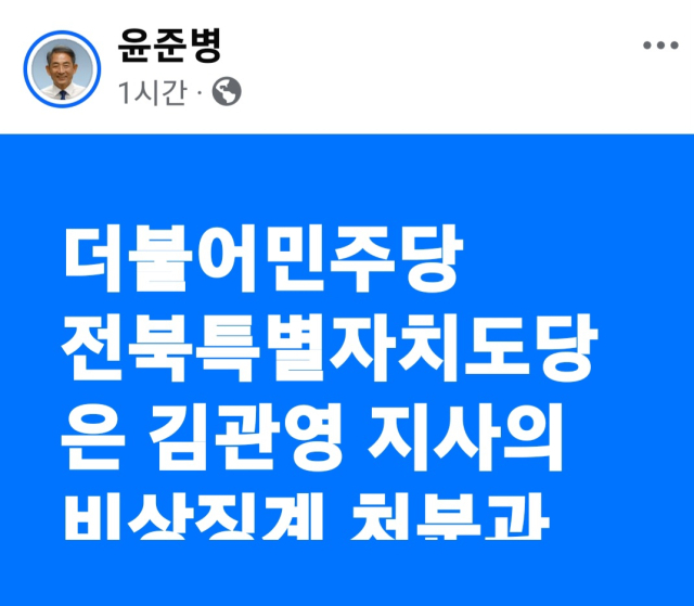 윤준병 민주당 전북자치도당위원장은 2일 페이스북에 올린 글에서 "전북도당은 김관영 지사의 비상 징계 처분과 관련해 해당 사건에 연루된 인원 전원에 대해 조사를 실시할 예정"이라고 밝혔다.