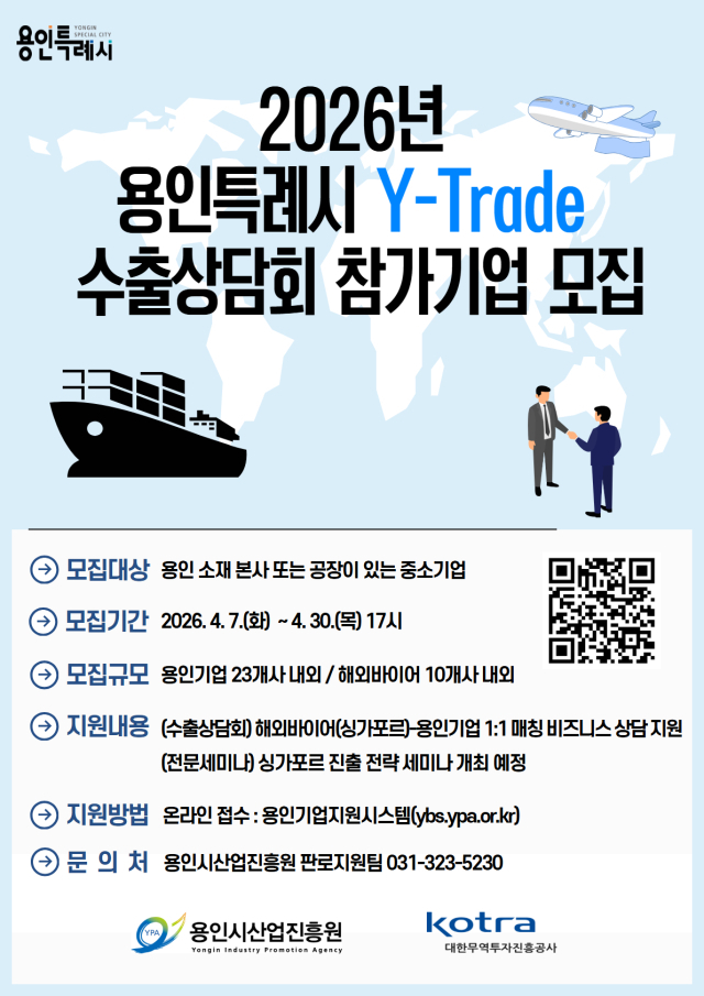 경기 용인시산업진흥원은 ‘2026년 용인특례시 Y-Trade 수출상담회’ 참가기업을 모집한다고 7일 밝혔다.