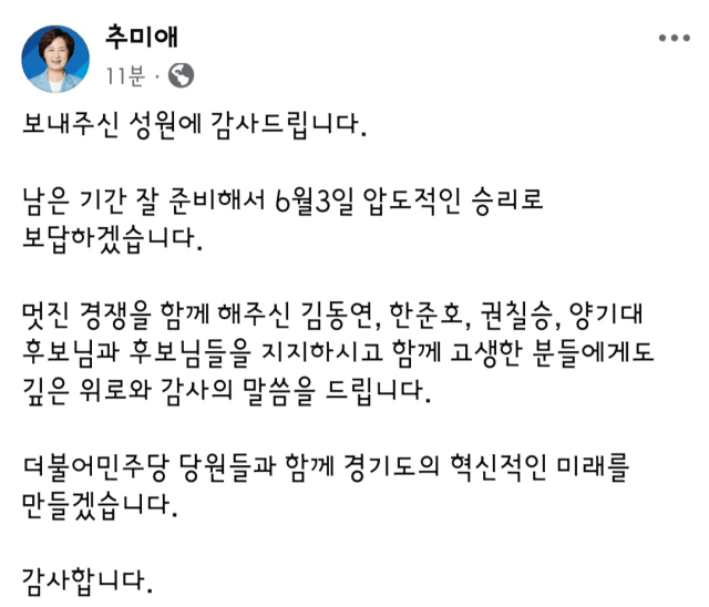 추 의원은 경선 결과 발표 직후 자신의 SNS를 통해 "보내주신 성원에 감사드린다. 남은 기간 잘 준비해서 6월 3일 압도적인 승리로 보답하겠다"며 "더불어민주당 당원들과 함께 경기도의 혁신적인 미래를 만들겠다"고 전했다.