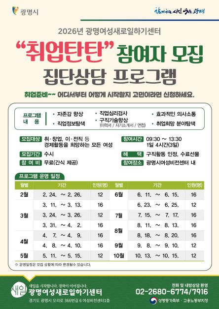 광명여성새로일하기센터가 운영하는 이번 프로그램은 취·창업과 이·전직을 희망하는 여성의 취업 역량 향상과 심리적 자신감 회복을 돕기 위해 마련됐다. 올해는 총 14회기에 걸쳐 200명을 대상으로 4월부터 10월까지 매달 일정에 따라 진행된다.