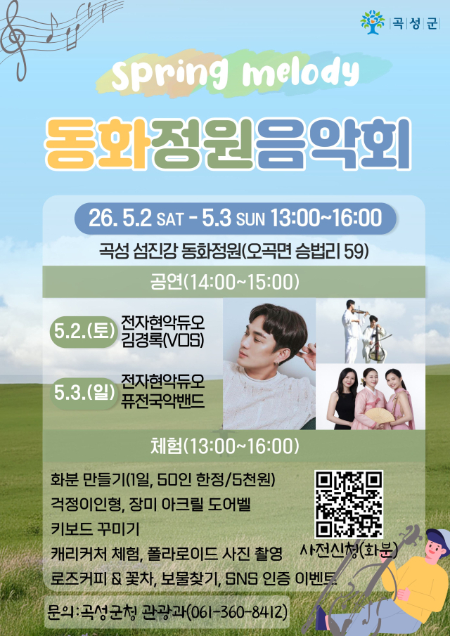 곡성군 관계자는 "봄꽃이 어우러진 동화정원에서 아름다운 음악과 함께 곡성의 매력을 더욱 깊이 느껴보시길 바란다"고 전했다.