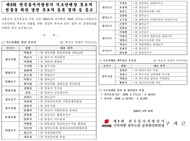 국민의힘 경북도당 공천관리위원회가 기초단체장과 광역·기초의원 공천 결과를 16일 발표한 가운데, 일부 지역 공천 보류와 현역 단체장 컷오프 등으로 지역 정가에 파장이 일고 있다.