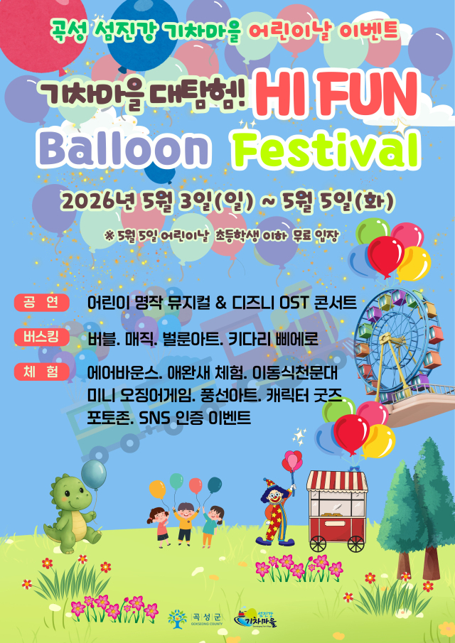 한편, 어린이날을 맞아 섬진강기차마을에서 펼쳐지는 '기차마을 대탐험! Hi Fun Balloon Festival'은 ▲어린이 뮤지컬 ▲디즈니 OST 콘서트 ▲매직 일루전 쇼 ▲DJ 랜덤댄스 공연 등이 준비되어있고 행사 기간 동안 마술쇼, 버블쇼, 벌룬아트, 키다리 삐에로 등 참여형 버스킹 공연도 상시 운영될 예정이다.
