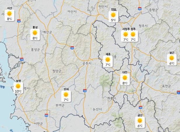 이날 낮 최고기온은 대전 23도, 세종·천안 25도, 청주 24도로 예보됐으며 아침 최저기온은 5도 안팎으로 기온차가 최대 20도에 이를 것으로 보인다.