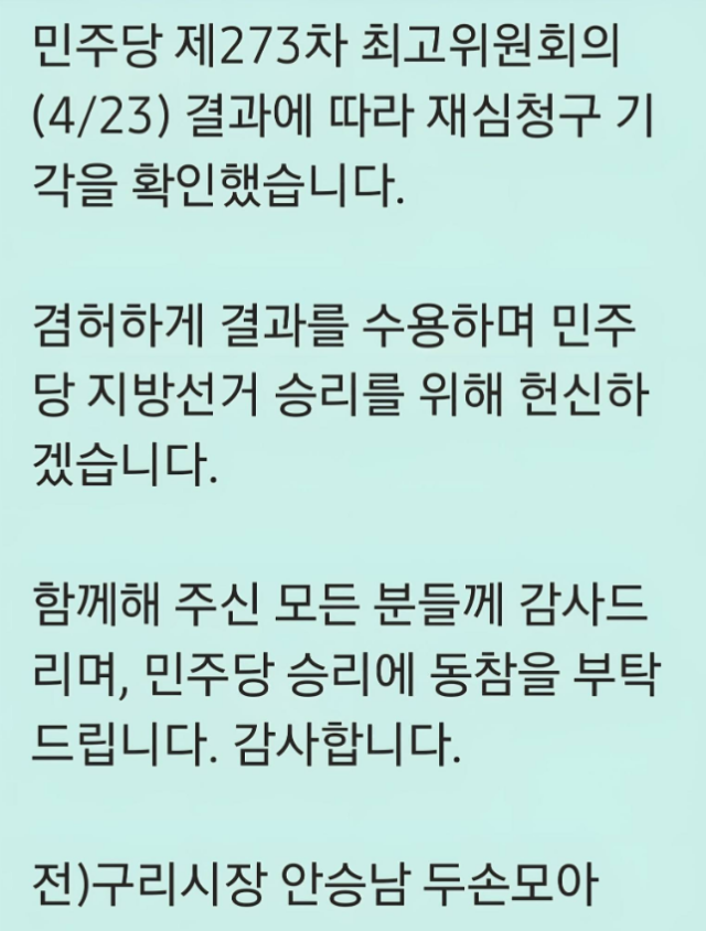 민주당 구리시장 후보 경선에 나섰다가 2차 경선에서 고배를 마신 후 이에 불복, 당에 재심을 청구했던 안승남 前 구리시장이 자신의 SNS를 통해 경선 결과에 승복한다는 입장을 밝혔다.