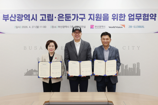 부산시는 지난 27일 시청 국제의전실에서 월드비전, 지밀레니얼(ZM-ILLENNIAL)과 함께 사회적 고립·은둔 가구 지원을 위한 업무협약을 체결했다고 밝혔다. 이날 협약식에는 박형준 시장, 김순이 월드비전 국내사업본부장, 박현수 지밀레니얼 대표가 참석했다.