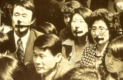 | ▲3.1사건 가족대책위원회가 재판 방청을 거부당하자 입을 십자 모양으로 봉하고 시위를 벌이고 있다. 오른쪽에서 두 번째 인사가 김대중 전 대통령의 부인 이희호 여사 ⓒ민주화운동기념사업회 사료 사진 |