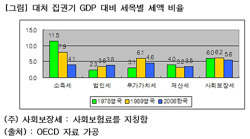 대처는 왜 그렇게도 개인소득세 부담을 낮추고 싶어 했을까. 그것은 당시 영국의 GDP 대비 개인소득세 비율이 OECD 평균인 9~10% 수준을 넘어서 있었기 때문이다. 과다한 감세였다는 비판을 별도로 한다면 대처는 그럴듯한 감세 명분은 가지고 있었던 셈이다.