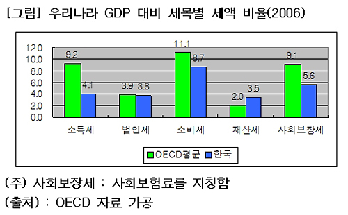 반면 2008년 소득세를 대폭 감세한 강만수 전 장관은 애당초 이런 명분 따위에는 관심조차 없었다. GDP 대비 개인소득세 비율이 OECD 평균의 절반도 되지 않았지만 그는 주저하지 않았다. OECD에 따르면 2006년 우리나라의 GDP 대비 개인소득세 비율은 4.1%로, OECD 평균 9.2%의 절반도 안된다.