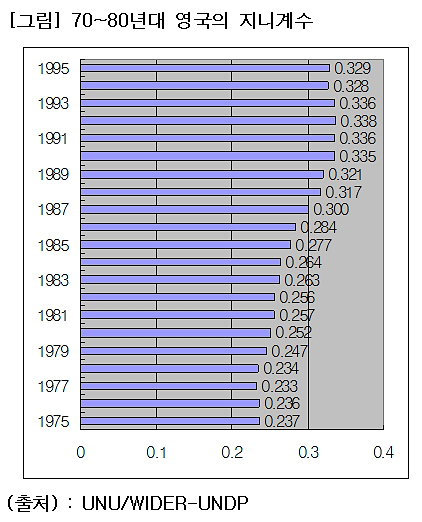 국제연합(UN) 소속기관인 국제연합대학교(UNU)의 보고서에 따르면 대처 집권기(1979~1990) 소득의 불평등도를 나타내는 지니계수는 극도로 나빠졌다. 대처가 집권하기 바로 전 해인 1978년 영국의 지니계수는 0.234였다. 그러나 그가 물러난 1990년에는 0.335로 악화되었다. 무려 0.101이나 나빠진 것이다. 이 기간 소득분배 악화율(=지니계수 악화율)은 무려 43.1%에 달했다.
