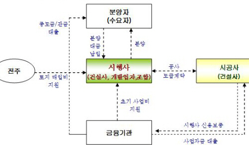 보통은 시행사보다 규모가 큰 시공사가 신용보증을 서서 금융기관이 시행사에 택지 매입비 등 초기 사업자금을 대주게 하는 한편 시공사 자신도 직접 자금을 대출받아 사업을 진행하게 된다. 이 과정에서 시행사와 시공사에 대출해준 금융기관은 분양이 이뤄진 뒤 해당 주택사업의 분양계약자들이 내는 중도금 및 잔금을 대출해주고 수익을 올린다. 분양계약자 입장에서는 분양 계약금을 낸 뒤 자신의 돈이나 금융기관에서 빌린 돈으로 중도금과 잔금을 치르고 아파트가 완공되면 입주하는 것이다. 이상이 선분양제 하의 주택건설 사업의 일반적인 모습이다.