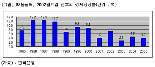 공교롭게도 두 행사가 개최된 이후 우리 경제가 크게 흔들렸기 때문이다. 1988년 11.7%까지 올라갔던 경제성장률은 1989년 6.8%로 급락했고, 2002년 7.2%까지 올랐던 성장률은 2003년 2.8%로 급락했다. 물론 그 원인을 88올림픽과 2002월드컵의 부정적 효과라 단정할 수는 없다. 그러나 어쨌든 이 두 행사의 효과를 추정해 내는 것은 생각만큼 쉽지 않다.