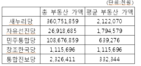 대한민국 국회의원들이 지닌 부동산이 얼마나 되는지는 아래 표를 보면 쉽게 알 수 있다. (자료 일자 : 2011년 3월 26일자, 자료 출처 : 국회공보_제2011-31호, 직계존비속 소유 부동산 제외, 공시가격 기준)