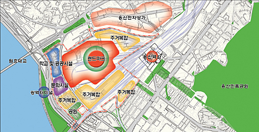 | ▲서부이촌동이 포함된 용산국제업무지구 개발 대상지를 나타낸 그림으로, 2007년 8월 17일 서울시가 밝힌 이 지역 시설 배치 계획이다. 그림에서 광역 터미널 인근의 학교 및 공공시설, 문화시설, 주거 복합, 공원 부지가 서부이촌동이다. 서부이촌동을 뚫음으로써 지역 땅값은 크게 치솟았다. 물론 재산권이 졸지에 제한된 주민은 수년째 난데없이 고통의 나날을 보내고 있다. ⓒ서울시 제공 |