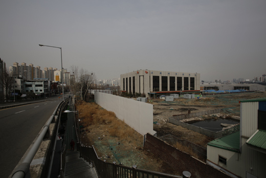 | ▲서부이촌동 진입로에서 바라본 옛 철도정비창 부지. 아직 이곳에는 시멘트 한 부대도 쏟아지지 않았다. 개발이 지연되면서 도시는 황량하게 변했다. ⓒ프레시안(최형락) |
