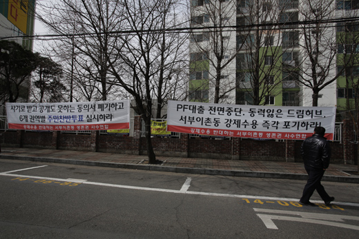 | ▲서부이촌동은 느닷없이 개발 대상에 포함된 후 해답 없는 어둠으로 가라앉았다. 19일 한 주민이 개발 반대 현수막이 걸린 아파트 단지 앞을 지나가고 있다. ⓒ프레시안(최형락) |