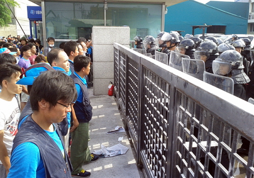 | ▲ 경찰 차림을 하고 헬멧, 방패, 곤봉으로 무장한 사설 경비업체 용역 직원들. ⓒ김상민 |