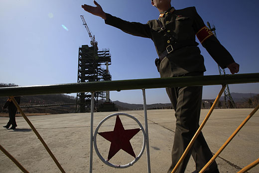 | ▲ 북한이 12일 오전 9시 51분 전격 로켓 발사를 감행했다. 사진은 지난 4월8일 서해발사장에서 장거리 로켓 '은하 3호'의 1∼3단계 추진체와 탑재물 장착을 완료하고 외신기자들에게 공개했던 현장입구 모습 ⓒAP=연합뉴스 |