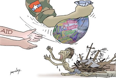 | ▲ 국제사회에서 온 구호품마저 가로채는 버마 군부를 비난하는 만평 |