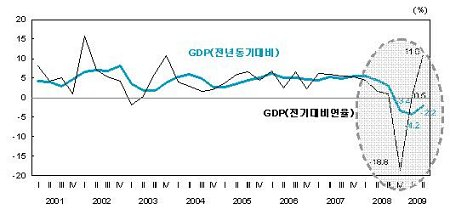 | ▲ 지난해말 경제 위기 이후 분기별 GDP 성장률이 전기 대비 가파른 반등세를 보였다. ⓒ한국은행 |