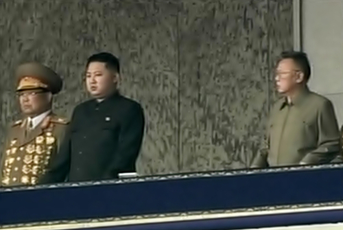 ▲ 김정일 국방위원장이 10일 노동당 창건 65주년 열병식 주석단에서 바로 옆에 서 있는 아들 김정은을 바라보고 있다. ⓒ조선중앙TV=연합뉴스