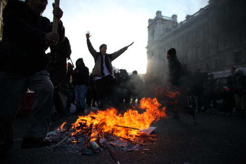 | ▲ 지난해 11월 영국에서 벌어진 들록금 인상 반대 시위에서 시위대가 피켓 등을 거리에서 태우고 있다. ⓒAP=연합뉴스 |