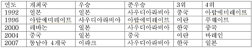 그래도 반 이상에서 4강에 들었다고 자위할 수도 있지만 지난 다섯 대회만을 돌이켜 보면 일본이 우승 3회, 4위 1회, 사우디아라비아가 우승 1회, 준우승 3회를 차지한 것과 대조적으로 우리나라는 3위를 2회 차지한 게 전부입니다. 중국이 준우승 1회, 3위 1회, 4위 1회를 차지했으니 중국에도 훨씬 못 미치는 결과를 거두었습니다. 또 다른 아시아의 맹주 이란도 3위를 두 번 한 게 전부이니 우리와는 동병상련을 느낄 만합니다.