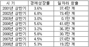 [표-2]를 보면서 결정적으로 드는 의문이 있다. 2008년 상반기 경제성장률은 5.3%로 비교적 양호한 편인데 왜 창출되는 일자리 수는 급감했을까. 아마도 박재완 수석은 5.3%라는 수치에 감격한 나머지 다른 수치들은 들여다 볼 생각을 못했을 것이다. 집권자 측근 입장에서 모든 지표들이 다 나쁜데 경제성장률 지표 하나만 양호할 때 그는 다른 지표들을 들여다보고 싶은 생각이 애초에 없었을 것이다.