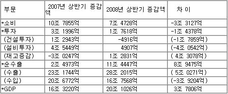 이런 기본적인 개념과 위의 식(3)을 토대로 하여 각 부문별 지출국민소득 증감액을 산출해 보고 2008년 상반기 성장률 5.3%의 함정을 찾아보면 다음과 같다.