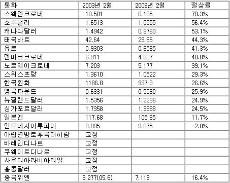 | (주) 절상률(%)=[(2003년 2월 말 환율-2008년 2월 말 환율)/2008년 2월 말 환율]x100 (원자료 출처) : 한국은행 홈페이지 |