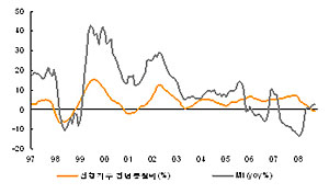 | ▲외환위기 이후 한국의 M1(협의통화) 증감률(회색)과 경기선행지수(노란색) 변동 추이. 외환위기 이후 큰 폭의 등락을 보였던 경기선행지수는 점차 진폭을 줄여가며 안정형으로 수렴했다. 선행지수 진폭이 컸던 이유는 더 드라마틱하게 변한 통화량 변화 때문이다. ⓒ유진투자증권 |