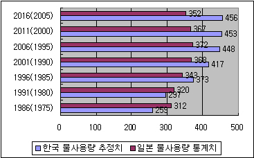 | ▲ (주) 한국의 경제수준과 생활수준이 일본보다 11년간 뒤쳐졌다고 가정하고 한국의 1인당 1일 생활용수 수요량 추정치와 일본의 사용량 통계치를 비교해 본 것임. |
