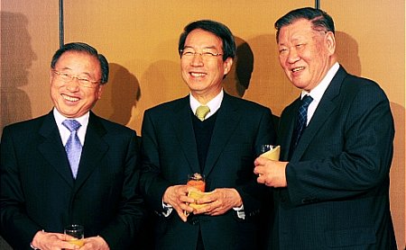 | ▲ 전경련 회장단과 만찬회동에서 활짝 웃고 있는 정운찬 총리(가운데). 왼쪽은 이 대통령 사돈인 조석래 효성 회장, 오른쪽은 정몽구 현대기아차 회장. ⓒ뉴시스 |