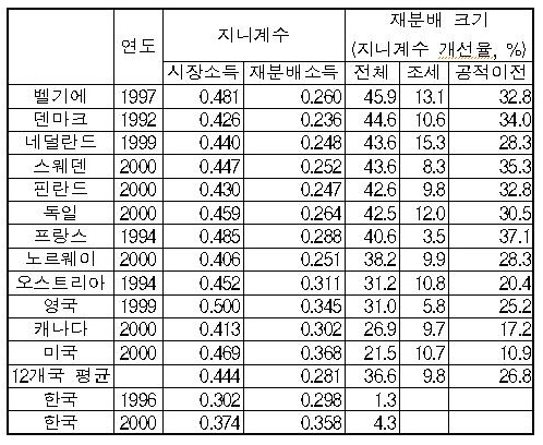 결과를 살펴보면, OECD 12개 국가들에서 평균적으로 조세와 공적이전을 통해 지니계수가 0.44에서 0.28로 바뀌어 형평성이 상당히 개선되었음을 알 수 있다. 프랑스는 1994년을 기준으로 계산했기 때문에 시간이 많이 흘렀으나 재분배정책이 매우 강력함을 알 수 있다. 그런데 자세히 살펴보면 영국, 미국, 캐나다 등 영미계 국가들의 재분배 규모가 작고, 유럽 국가들의 재분배 규모가 크다는 것을 알 수 있다. 그러면, 우리나라는 어떠한가? 외환위기 이후에는 소득 불평등도가 상당히 증가했음에도 불구하고 조세와 공적이전을 통한 소득재분배가 크게 개선되지 않았다.